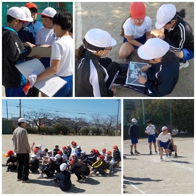 4年生の体育では、「ハンドベースボール」に取り組んでいます。キャッチボールやTバッティングなどの練習を通して、ボールを投げたり捕ったりする動きに慣れてきました。チームで声をかけ合いながらミニゲームにも挑戦し、どうしたらアウトにできるか、どうしたら点を取れるかを考えながら活動しています。友達と協力しながら、元気いっぱい体を動かしています。