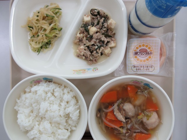 今日の献立は、ごはん・牛乳・とうふのレバーそぼろいため・きりぼしだいこんのちゅうかサラダ・とりだんごスープ・プリンタルトです。