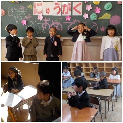 さくらの花びらが舞う、暖かな日差しのもと、入学式が行われました。みんな「にっこにこ」の笑顔で入学することができました。
