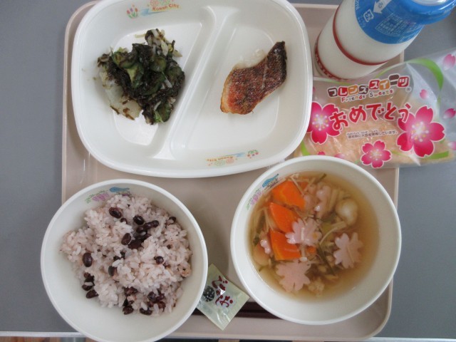 4月15日の献立は、せきはん(ごましお)・牛乳・めばるのしおやき・いそかあえ・さくらかまぼこのすましじる・おいわいクレープです。