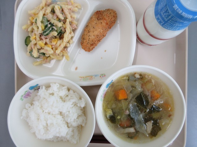 今日の献立は、ごはん・牛乳・しろみざかなのこうそうフライ・マカロニサラダ・オニオンスープです。