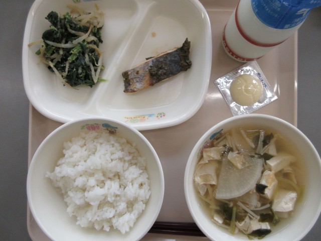 今日の献立は、ごはん・牛乳・むしさわらのうめだれ・ほうれんそうのごまあえ・ゆばのすましじる・かたぬきチーズです。