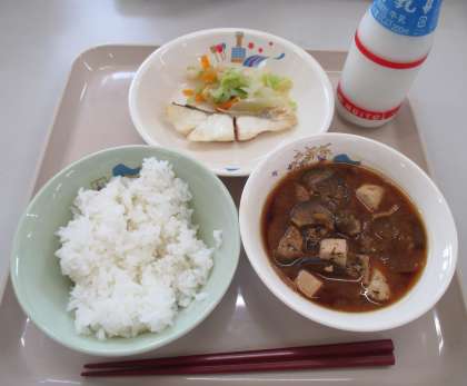 今日の給食は、ごはん・牛乳・スズキの塩焼き・キャベツの和え物・ナスとあかもくの味噌汁です。