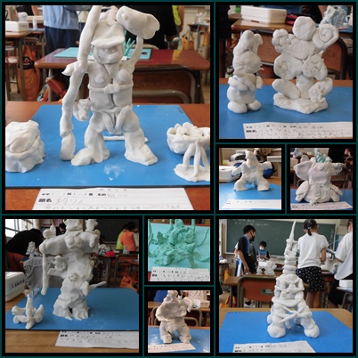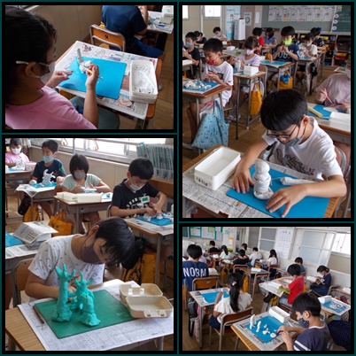 図工の授業の様子です。バランスを崩すとすぐに倒れてしまう粘土に苦戦しながらも、なんとか作品を完成させることができました。へらやかきだし棒、糸などを使い、細かい模様をつけている子がいて、注目を浴びていました。