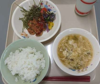 今日の給食は、ごはん・牛乳・花形ハンバーグの和風トマトだれ・五色サラダ・かき玉汁です。