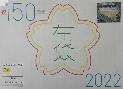 創立150周年記念の航空写真撮影を、9月26日(月)の2時間目に行います。そのデザインが決まりました。子どもたちは色とりどりのエプロンを着て、上画像のようなカラーデザインを描きます。