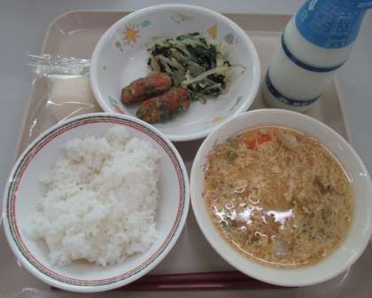 今日の給食は、ごはん・牛乳・ちくわの磯辺揚げ・千草和え・かきたま汁・なしです。