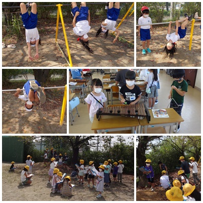 9月の体育の授業は、鉄棒をしています。互いにできる技を教えあいながら、協力して練習に取り組んでいました。また、生活の授業では、木の観察をしました。もうすでに葉っぱの色が変化しているものがあり、葉っぱの色が変化していくことに不思議を感じていました。