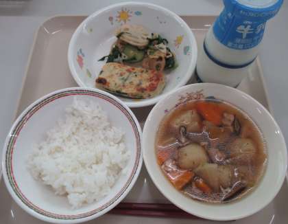 今日は食育の日です。大豆・れんこん・キャベツ・にんじん・あかもくが愛知県産、小松菜は江南市産です。地元・愛知県の味を楽しみましょう。