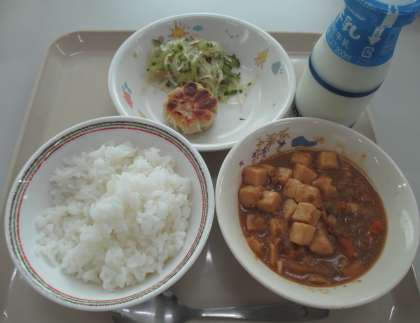 今日の給食は、ごはん・牛乳・にらまんじゅう・麻婆豆腐・バンサンスーです。