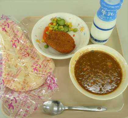 今日の給食は、ナン・牛乳・大豆ミートのキーマカレー・コロッケ・カラフルサラダです。