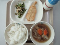 今日の給食は、ごはん・牛乳・あじフライ・キャベツの梅おかか和え・手まりふのお吸いものです。