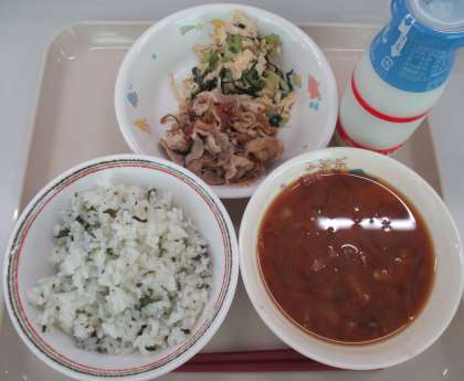 今日の給食は、わかめご飯・牛乳・ゆで豚の甘酢かけ・小松菜の湯葉和え・じゃがいものみそ汁です。