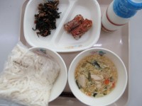 今日の給食は、ごはん・牛乳・にぎすのあおさフライ・いとこ煮・めった汁です。