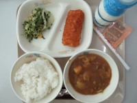 今日の給食は、麦ご飯・牛乳・ポークカレー・オムレツ・れんこんチップス・ココア牛乳の素です。