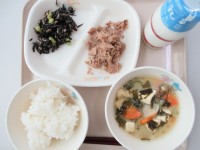 今日の献立は、ご飯・牛乳・コロコロあつあげのそぼろあんかけ・いろどりいため・ごもくじる・さくらんぼです。