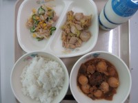 今日の献立は、ごはん・牛乳・あげぎょうざ・ぎゅうにくとやさいのほそぎりいため・サンラータンです。