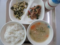 今日の献立は、みそにこみうどん・牛乳・だいずとサツマイモのかりんとう・こまつなのおひたしです。