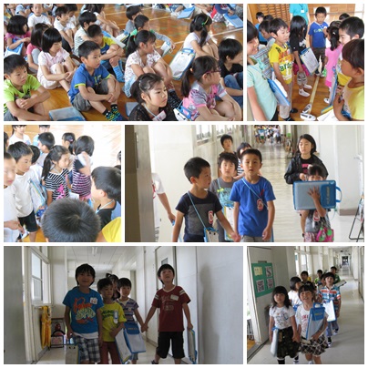 去年、2年生から説明をしてもらったように、「ここは、○○する教室だよ。□□や△△があるね。」って、1年生に教えてあげました。北舎1・2・3階、南舎1・2・3階、体育館を全部案内するのは大変でしたね。