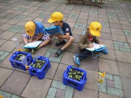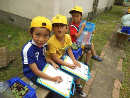 生活科の授業では、アサガオの成長の様子を絵日記にまとめています。写真は芽の観察をしている様子です。葉っぱの形や色に注目して、みんな前向きに観察をしています。