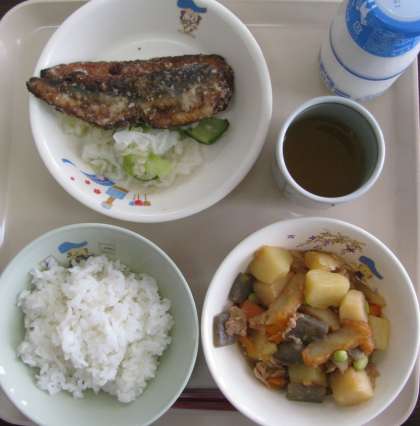 トビウオは、翼のような胸びれを持ち、敵に追われると軽く100m以上飛びます。春から夏が旬の白身魚で、給食では竜田揚げにしました。
