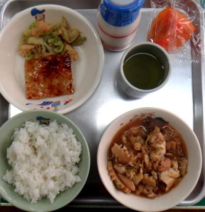 愛知のスズキ入りはんぺんの焼きづけ、ひきずり、カリフラワーのゴマ和え、柿、ご飯、牛乳