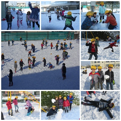 1時間目は雪遊びにしました。手袋をしていない子や長靴を履いていない子は「冷た〜い。」と言っていましたが、楽しさに寒さ・冷たさを忘れ、雪だるま作りをしたり、雪合戦をしたり、ふわふわの雪に寝転がったり・・・・、いろいろな遊びで楽しみました。