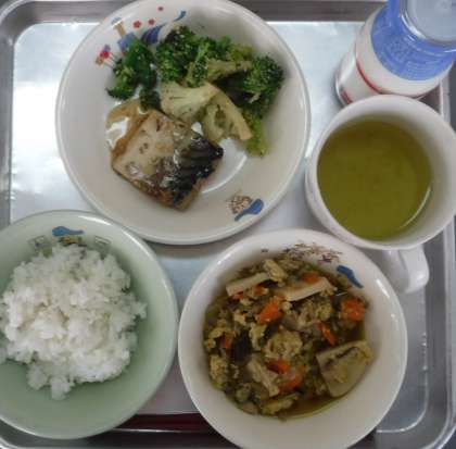 サバのおかか煮、高野豆腐の玉子とじ、花野菜のアーモンド和え、ご飯、牛乳