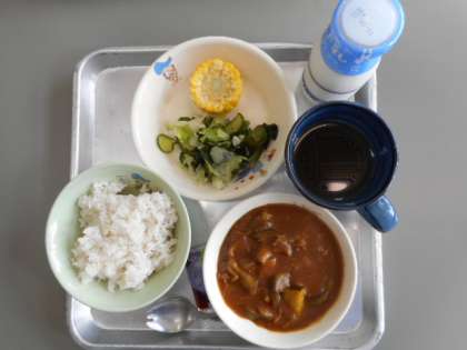 江南トマトとナスのカレー、キュウリとワカメのサラダ、トウモロコシ、麦ご飯、牛乳