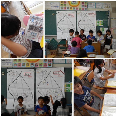 原稿を指さしながら読み上げる姿、絵地図を指さす姿、聞き手の心を動かすにはどうしたらよいかと仲間と考える姿が見られました。