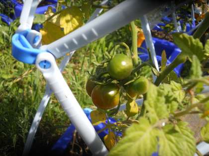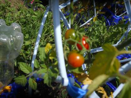 一人一鉢育てているミニトマトにたくさん実がなり,赤く色づいてきました。赤くなった実は,収穫して家に持って帰ります。