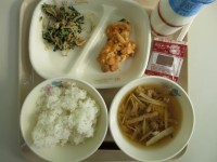 笹かまぼこの生姜醤油、油麩入りにしめ、おくずかけ、ご飯、牛乳