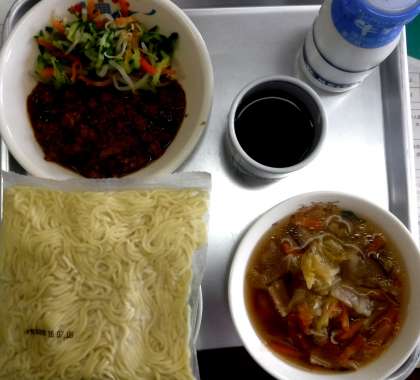ジャージャー麺(肉味噌、千切り野菜)、サンラータン、中華麺、牛乳