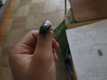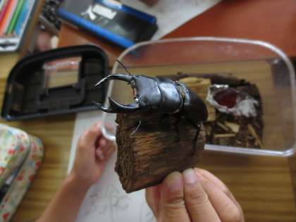 クラスの児童も,自宅でいろいろな昆虫を飼育していました。のこぎりが立派なクワガタ,緑の羽根が美しいコガネムシ,おたまじゃくしから孵って間もない小さなカエル,バッタ,コオロギ,雌雄のカブトムシもいました。