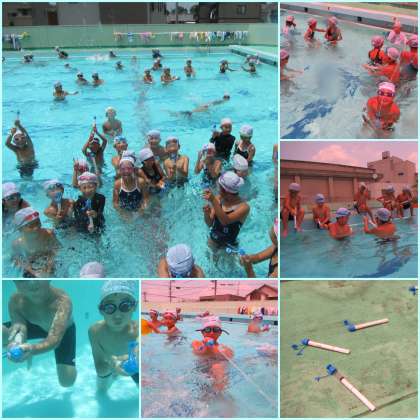 学年でそろって,プールで理科の学習です。空気や水の性質を利用した水鉄砲を使って,全力で楽しみました。