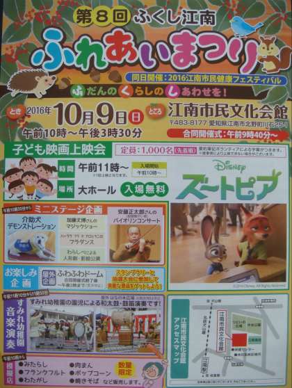 今日10月9日10時から午後3時30分まで、江南市民文化会館に於いて、第8回 ふくし江南 ふれあいまつりが開催されます。