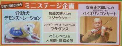 展示室では、10:30から介助犬デモンストレーション、10:55から安藤正太郎さんのバイオリンコンサートがあります。