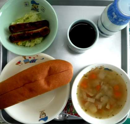 ホットドッグ(焼きウィンナー)、ケチャップ、キャベツとコーンのソテー、オニオンスープ、サンドイッチロールパン、牛乳