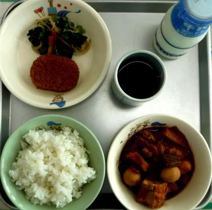 愛知県野菜のコロッケ、味噌おでん、江南産小松菜のおひたし、ご飯、牛乳