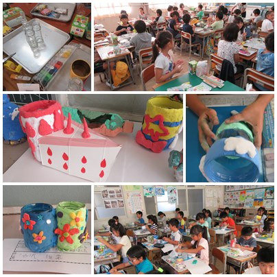 3年生の図工の様子です。粘土に絵の具をまぜて、いろいろな色の粘土をつくり、子どもたちのアイデア満載の小物入れをつくりました。