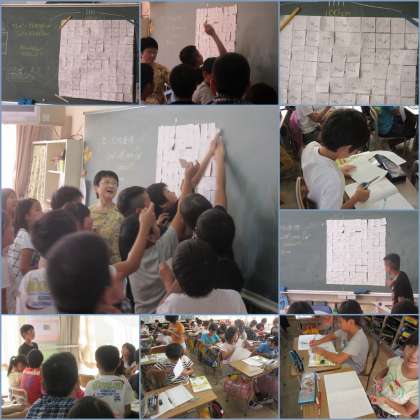 方眼紙で100平方センチメートルをつくり,みんなで協力して貼っていきました。