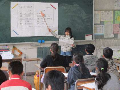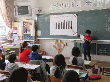3年生の国語の授業の様子です。グラフや表などの資料から分かったこと、思ったことを分けて話すことを練習しました。資料のどの部分を説明しているか、指し示しながら、聞き手に目を向けて話せています。