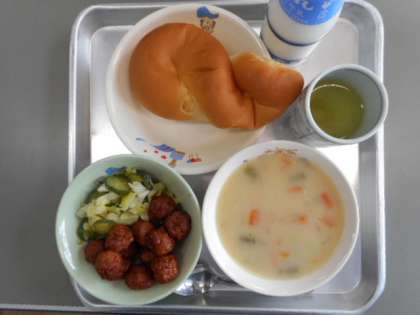 ミートボールのケチャップからめ、グリーンサラダ、春野菜のチャウダー、ツイストロールパン、牛乳