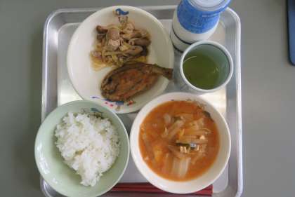 鮎の唐揚げ、けいちゃん焼き、各務原キムチ汁、ご飯、牛乳