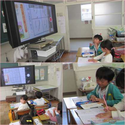 児童のひらがなノートを大型モニタに映してみんなで見ています。