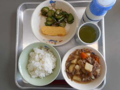 厚焼き卵、肉じゃが、キュウリの塩昆布あえ、ご飯、牛乳