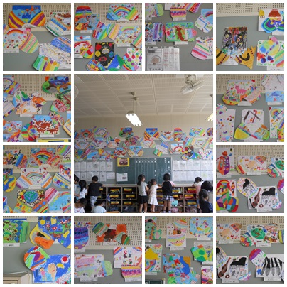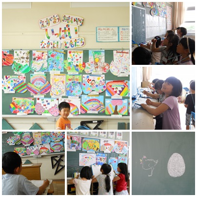 二年生になって一つ目の作品が完成したクラスが多いようで、今日は2クラスが鑑賞会を行っていました。いろいろな形のたまごが、いろいろな割れ方をして、中からは想像もつかないような世界が飛び出してくる作品ばかりでした。六月の日曜参観まで掲示しておくので、よかったら見ていってくださいね。
