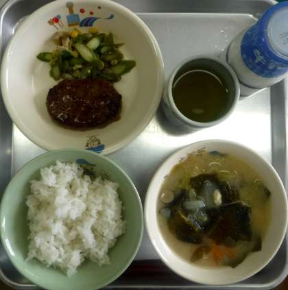 ハンバーグの照焼ソース、アスパラの炒め物、レタスの白味噌汁、ご飯、牛乳
