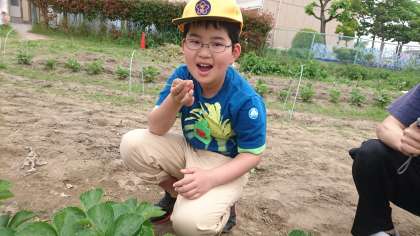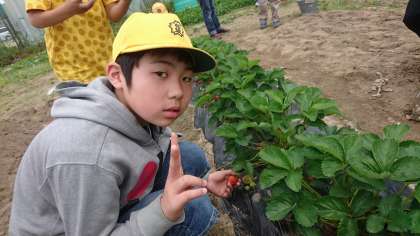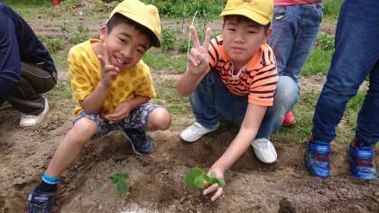 6・7・8組合同で大豆の苗植えを行いました。苗を手に取って子どもたちは一本一本丁寧に植えていきました。夏に美味しい枝豆として食べることができたらよいなと思っています。その後,イチゴ狩りを行いました。大きくて甘いイチゴを取り,みんなで美味しく食べることができました。