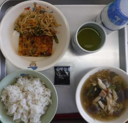 野菜入り豆腐ステーキ、切り干し大根の煮物、山菜汁、海苔の佃煮、ご飯、牛乳